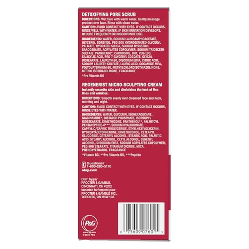 Treat yourself to a rejuvenating spa-like treatment at home, this duo pack is invigorated with two anti-aging powerhouses in one set. Our Olay Regenerist Detoxifying Pore Scrub Cleanser and Olay Regenerist Micro-Sculpting Cream help provide visible results for brighter skin and reduced appearance of wrinkles starting on day 1. The anti-aging face cleanser with exfoliants deep cleans and gently exfoliates dead skin cells for spa-like prep for daily skincare. Skin is immediately smooth and refreshed. Micro-sculpting cream completes the treatment with a unique, moisture-binding formula with Amino-Peptide Complex II that instantly plumps and lifts skin cells. The advanced formula delivers anti-aging ingredients 10 layers deep into the skin's surface to correct the look of deep wrinkles and improve skin's texture and elasticity. It's the perfect way to achieve fully hydrated, ageless skin.