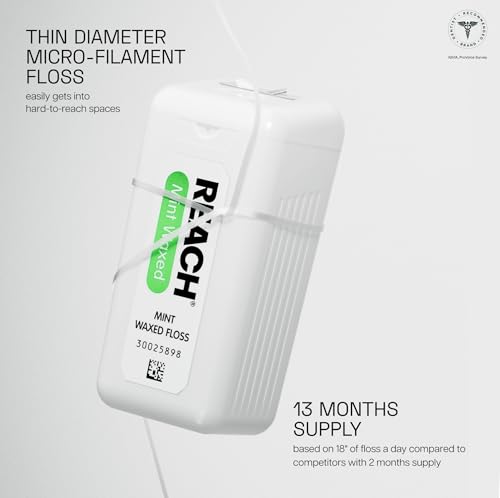 Reach Mint Waxed Dental Floss is Reach 's number-one-selling floss. This mint floss is waxed to slide easily between teeth while it removes plaque and food particles. It is accepted by the American Dental Association and is designed to clean between teeth and under the gum line. Flossing is part of a dentist-recommended oral care routine that is designed to remove plaque and help prevent gum disease.