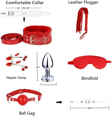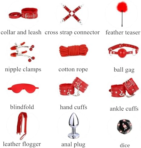 Sex Bondage Restraint Kits BDSM Toys 12 Pcs Handcuffs Ankle Cuffs Anal Plug Nipple Clamps Ball Gag Blindfold Rope Leather Restraints Set Adjustable for Adult Beginners (Red)