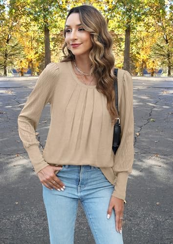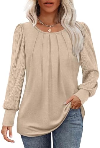 XIEERDUO Women's Long Sleeve Shirts Pleated Crew Neck Puff Sleeve Tunic Tops